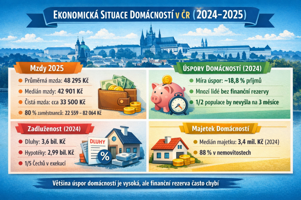 | Úspory domácností (% disponibilního příjmu) | 18,8 % (2024) | EU: ~12-14 % (výrazné rozdíly stát od státu) |