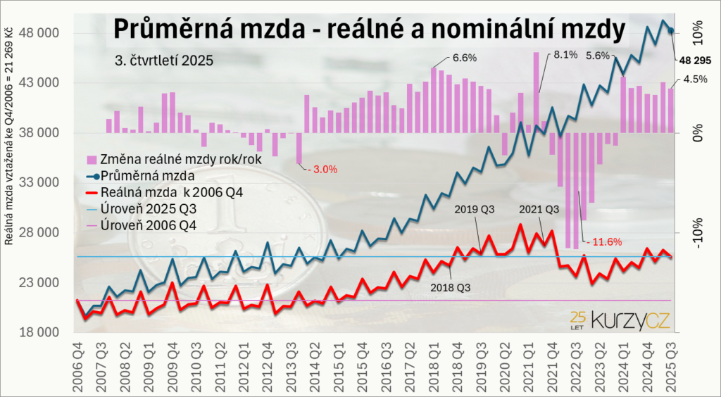 | Reálný růst mezd | +~4,5 % (2025) | EU: +2-5 % v průměru, heterogenní vývoj |