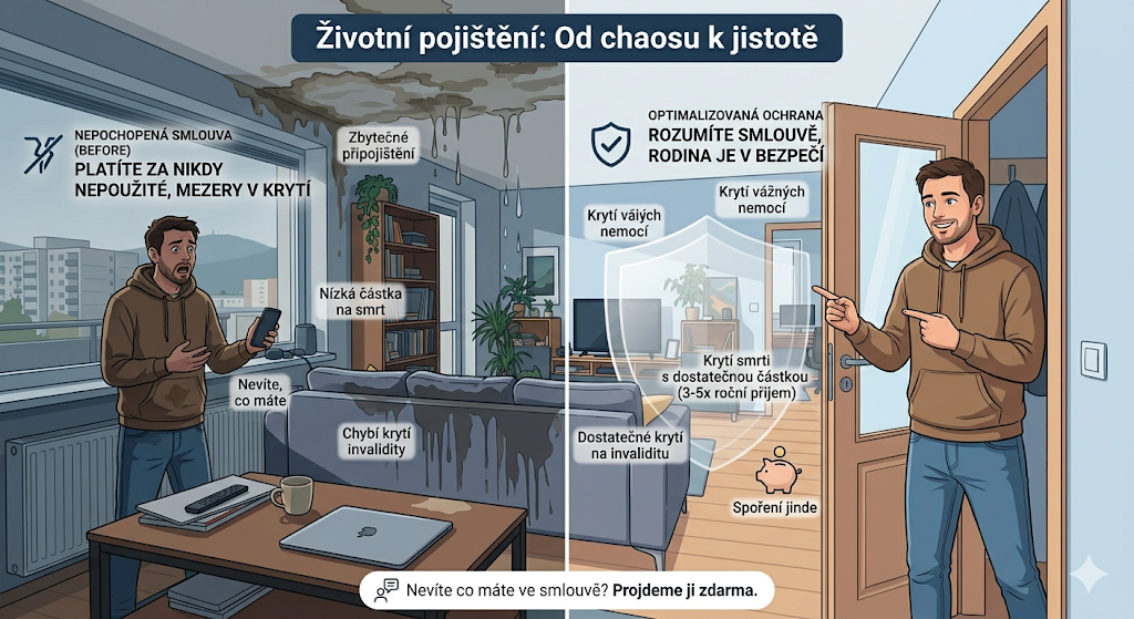 Životní pojištění je jeden z nejvíce nepochopených finančních produktů. Lidé ho buď nemají vůbec, nebo platí za něco, čemu nerozumí. Když projdu smlouvu s klientem poprvé, skoro vždy najdeme buď zbytečné připojištění, nebo naopak zásadní mezeru v krytí.